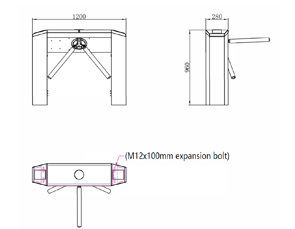 Tripod turnstile is the most basic type of pedestrian turnstile gate, which is composed of the chassis, mechanism, and three blocking rods which stop or release by rotating 120° each time. Its components include chassis, mechanism, drive control board, motor, limit, direction indicator board, access control part, optional counter, etc. The metal rod (rod length standard 50cm) forms a spatial triangle as the blocking body (brake rod). It is made of 304 or 316 stainless steel, which is durable and not easy to deform. The blocking and releasing are achieved by rotation.